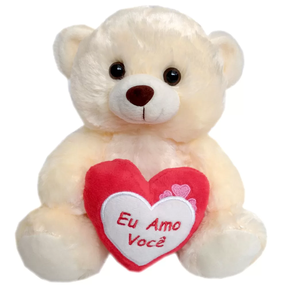 Urso de pelúcia com 21 cm de altura, produzido com pelúcia macia e enchimento em fibra siliconada antialérgica, oferecendo conforto e segurança. Produto certificado pelo Inmetro, ideal para todas as idades.